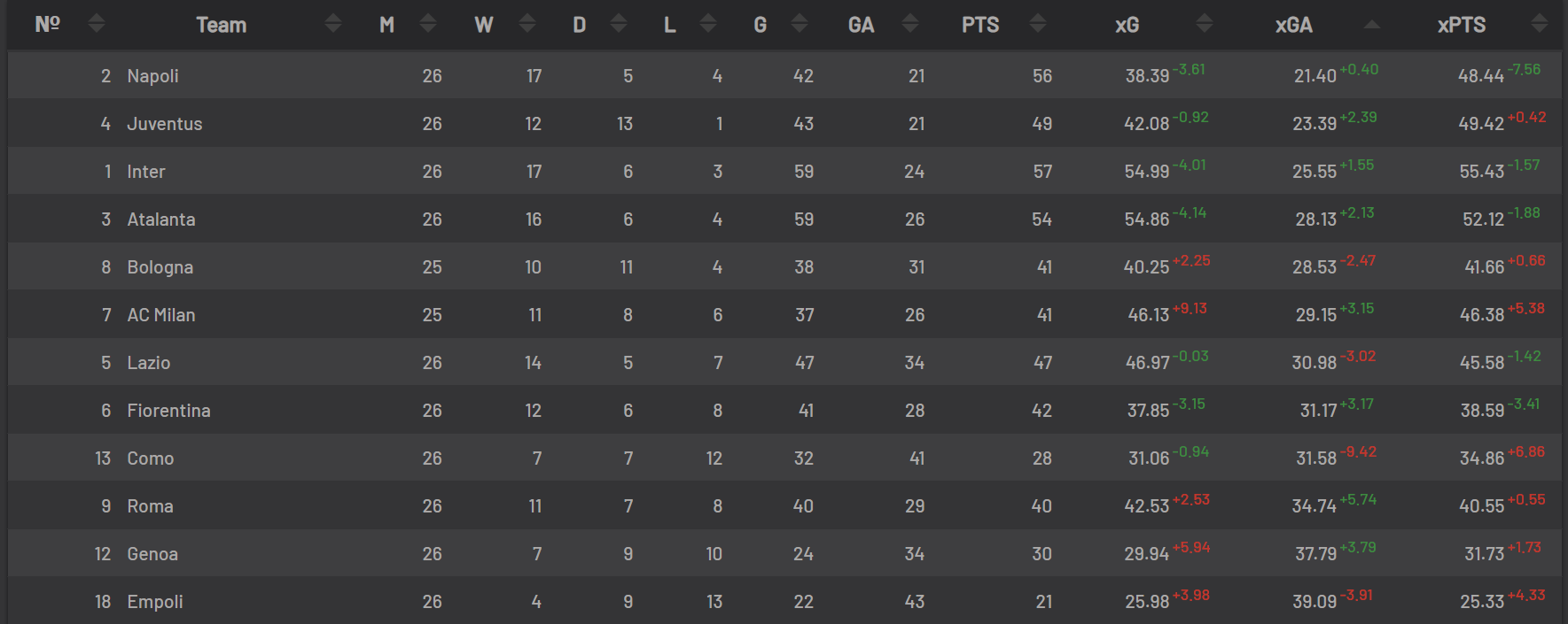 While defensively sound, Como doesn’t create a high volume of chances (low xG) and doesn’t score a lot of goals. Their overperformance in key moments has kept them competitive, but sustaining this efficiency will be challenging.